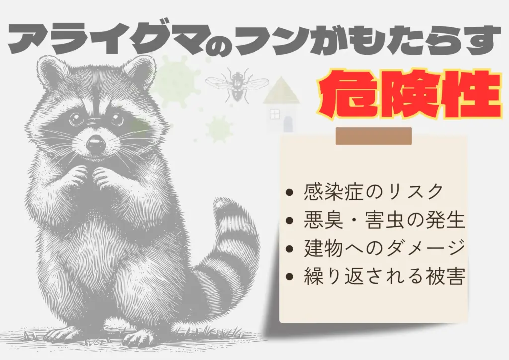 かわいらしい見た目とは裏腹に、アライグマのフンは感染症のリスクや家屋の劣化など、さまざまな被害の原因となります。