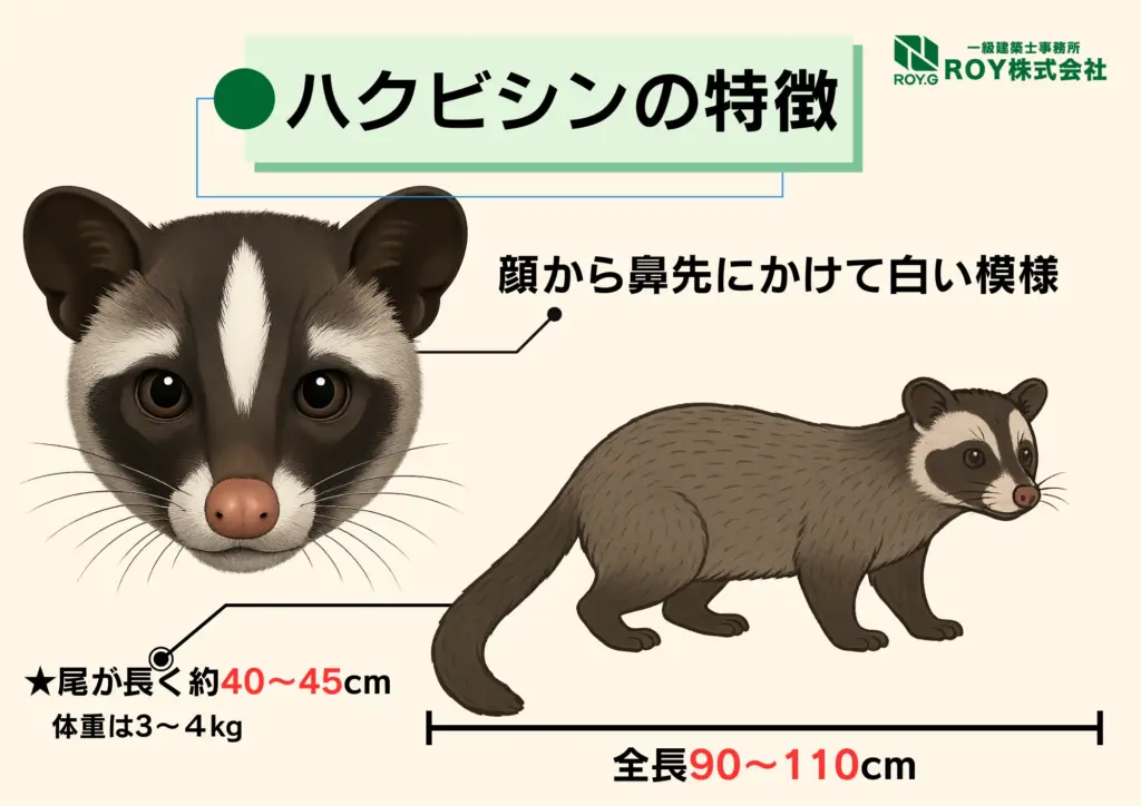 ハクビシンは顔に白い線が通っているのが特徴で、本体は、山や森に生息していますが、近年では、都市部でも頻繁に見られるようになりました。