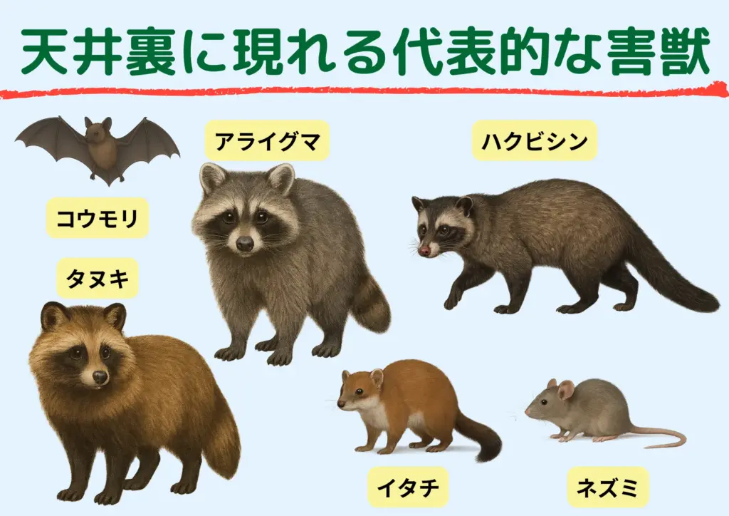 これから、天井裏から物音がする原因として考えられる代表的な害獣の種類を紹介します。