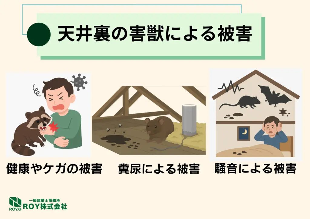 天井裏に害獣が入り込むと、「音がうるさい」だけでは済まないさまざまな被害が発展します。