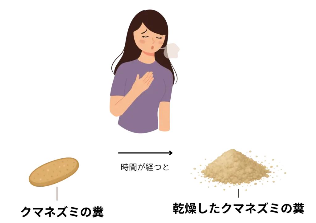 クマネズミの糞尿は、時間が経つと乾燥して粉末状になります。この粉末が空気中に舞い上がり、人が吸い込むことで呼吸器系から感染することがあるのです。特にハンタウイルスなどは、この経路での感染が主です。