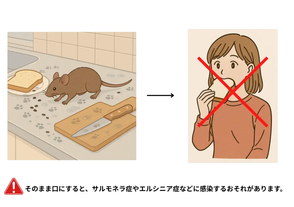 ネズミが台所を徘徊すると、足跡・体液・糞などが食品や調理器具に付着します。その汚染された食品を知らずに口にすることで、サルモネラ症やエルシニア症などに感染します。