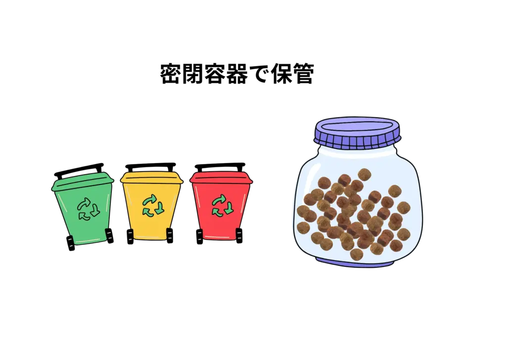 生ゴミ・ペットフードは密閉容器で保管 ― 夜間、台所に生ゴミを放置するのは絶対に避けましょう。ペットフードも食べ残しをそのままにせず、密閉容器に入れて保管してください。