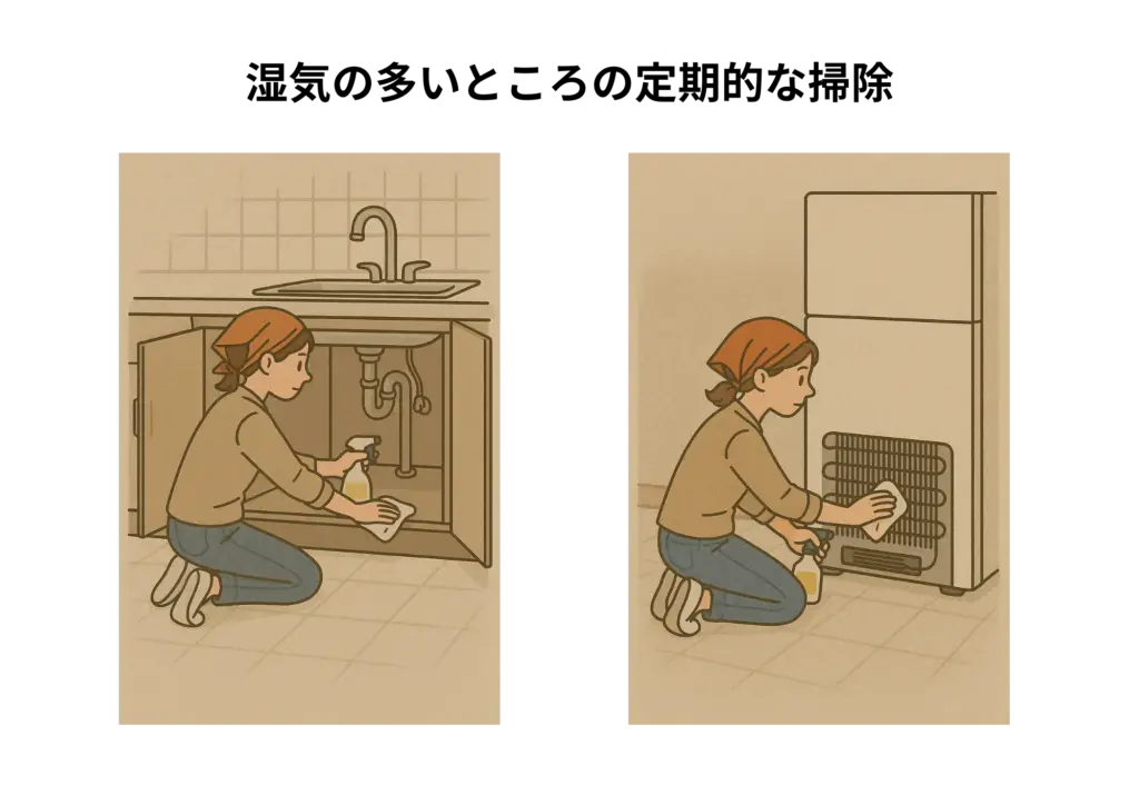 シンク下や冷蔵庫裏など、湿気の多い場所を定期清掃 ― これらの場所は食べかすや水分が溜まりやすく、ネズミにとって格好の餌場となります。定期的に清掃し、清潔を保ちましょう。