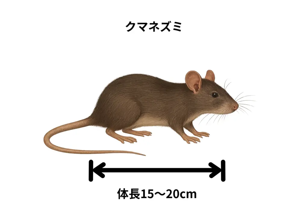 クマネズミは、体長15〜20cm、長い尾を持ち、壁や配管を垂直に登ることができる「高所型のネズミ」として知られています。ドブネズミやハツカネズミと異なり、人間の生活空間により近い場所で活動するのが特徴です。