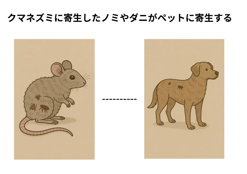 ネズミの体表に寄生するダニやノミが、人や家庭内のペットに移ることで、間接的に病原体が伝播します。ネズミがいなくなった後も、残されたダニやノミが感染源となることがあります。