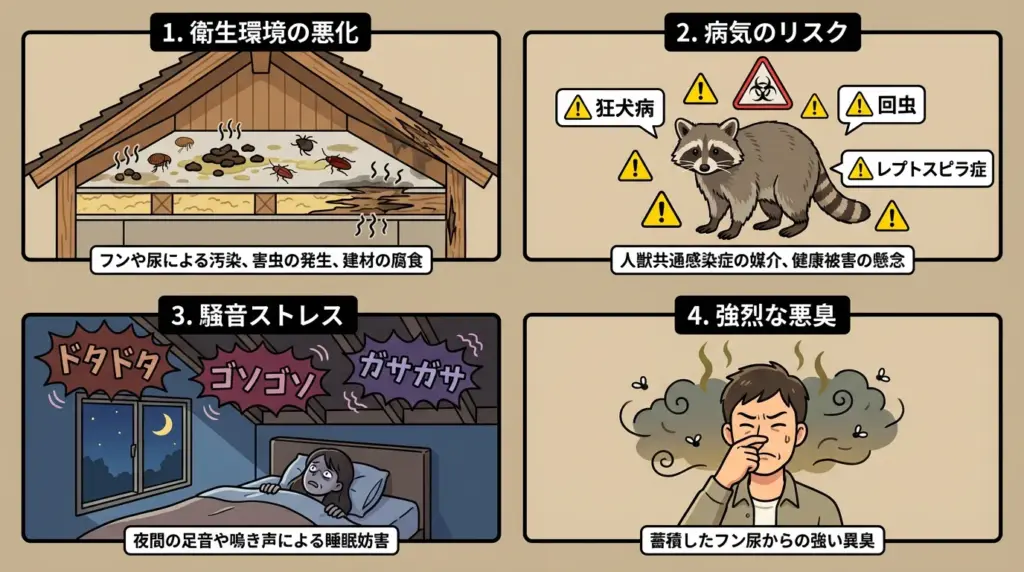 アライグマの足跡は、放置すれば家屋被害・悪臭・騒音・健康リスクなど、さまざまなトラブルにつながります。