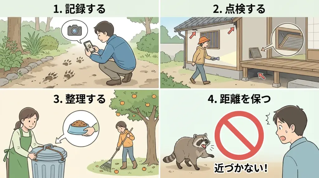 家の周りでアライグマらしき足跡を見つけたら、まずは落ち着いて状況を確認しましょう。