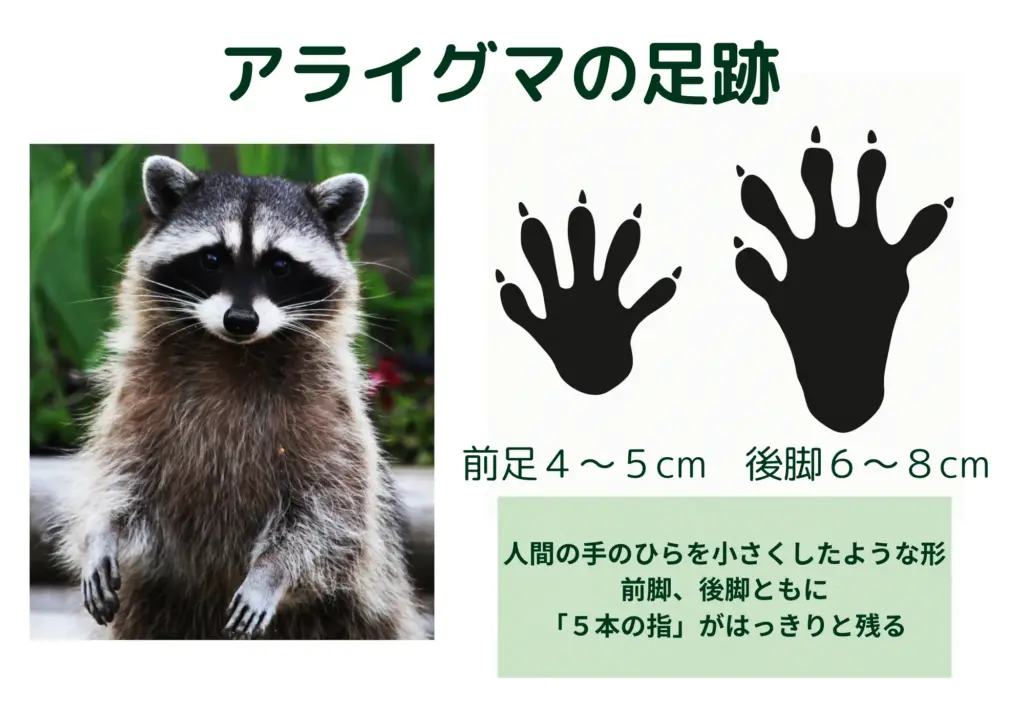 もし、5本指のはっきりした跡を見つけたら、アライグマの可能性を強く疑いましょう。