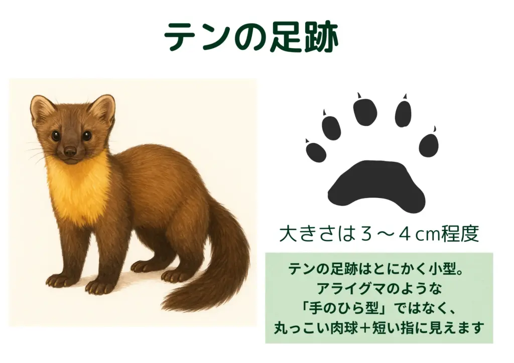 見極めのポイントは、テンの足跡はとにかく小型。アライグマのような「手のひら型」ではなく、丸っこい肉球+短い指に見えます。大きさでほぼ判別ができます。
