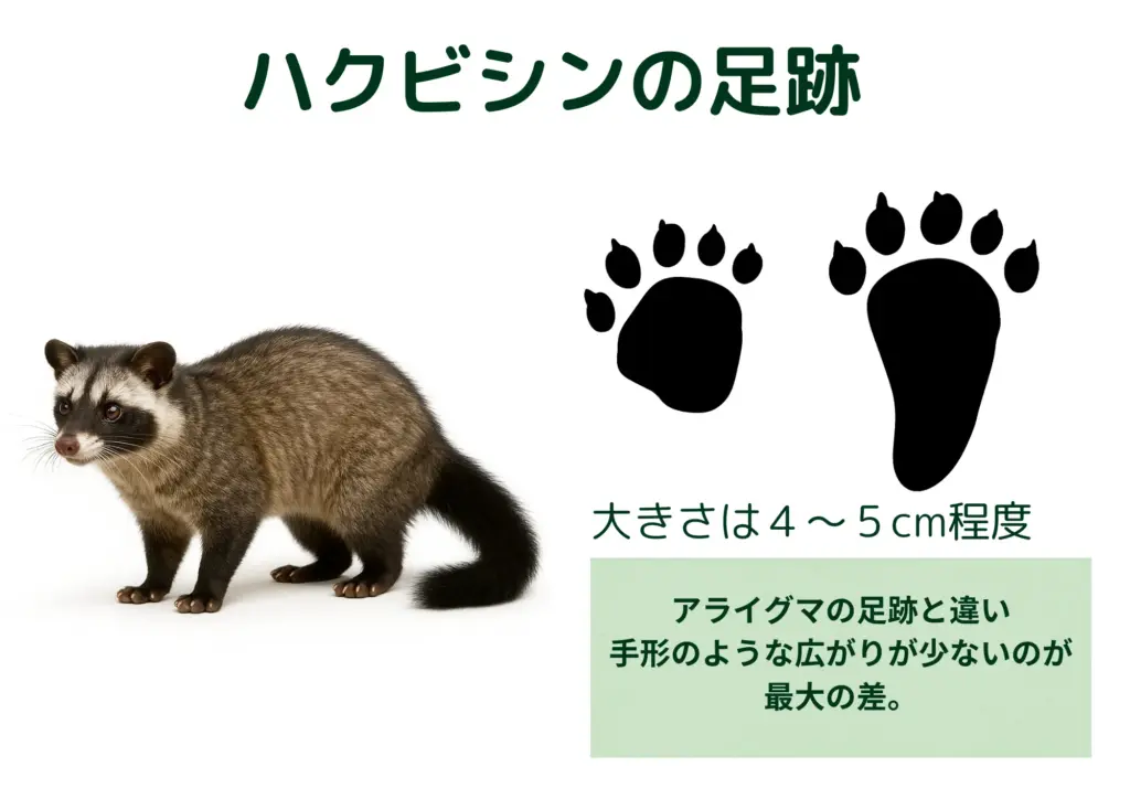 アライグマの足跡は特徴的ですが、実はハクビシン・テン・アナグマの足跡と混同されるケースも少なくありません。