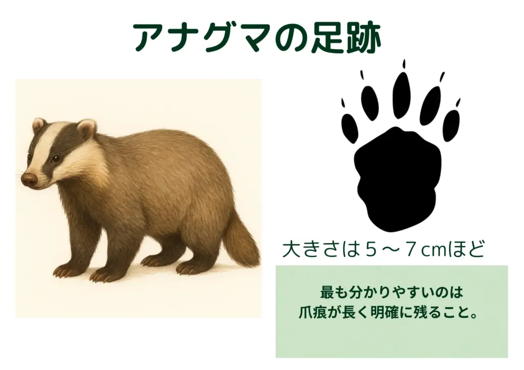 | アナグマ | 5本指・太く短い指+長い爪跡が残る | 5〜7cm(アライグマと近い) | 長い爪痕がくっきり残るのが最大の特徴 |