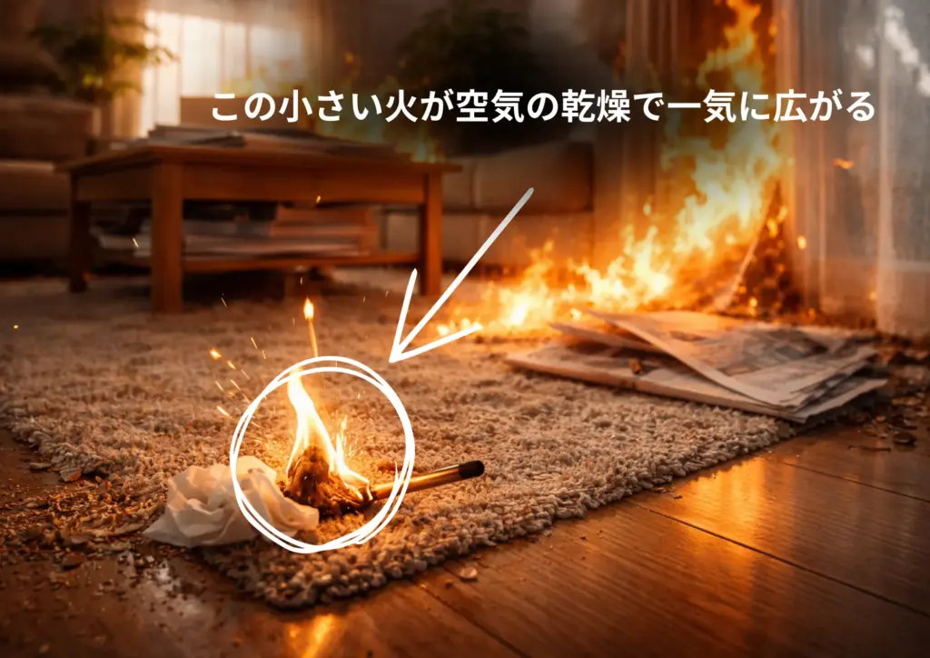 この乾燥した環境では、木材・紙・衣類・カーテンなどの可燃物が水分を失い、非常に燃えやすい状態になります。通常なら燃え広がるのに時間がかかる素材でも、乾燥していると小さな火でも一気に燃え広がる危険性があります。