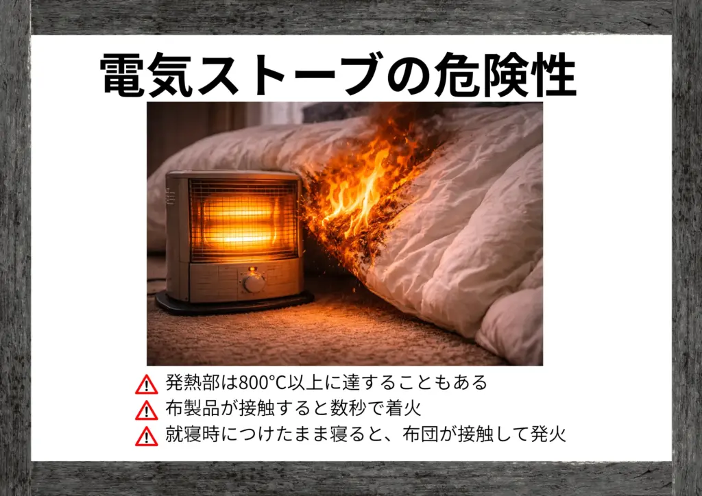 電気ストーブは直接火を使わないため安全に見えますが、実は発熱部が非常に高温になり、近くの可燃物に引火する危険があります。