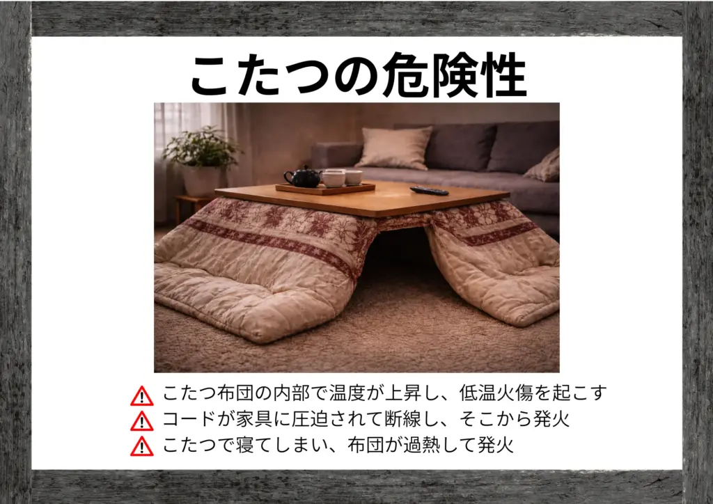特にこたつは「火を使っていない」という安心感から油断しがちですが、内部での火災は外から見えにくく、気づいたときには手遅れになることもあります。