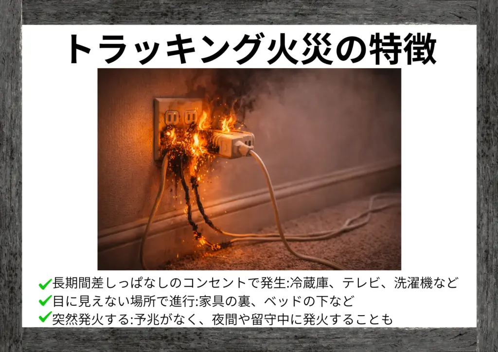 トラッキング火災とは、コンセントとプラグの間に溜まったホコリが、湿気を帯びて電気を通し、火花を発して発火する現象です。