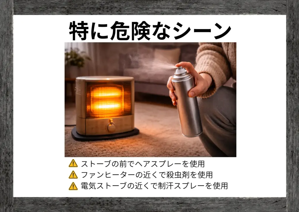 ヘアスプレー、殺虫剤、整髪料、制汗スプレーなどは、可燃性の噴射ガス(LPGなど)を含んでいます。これらを暖房器具の近くで使用すると、ガスが引火して爆発的に燃焼する危険があります。