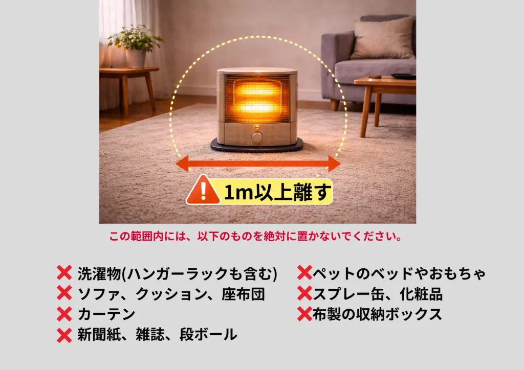 ストーブ周辺1m以内は「危険ゾーン」と認識しましょう。