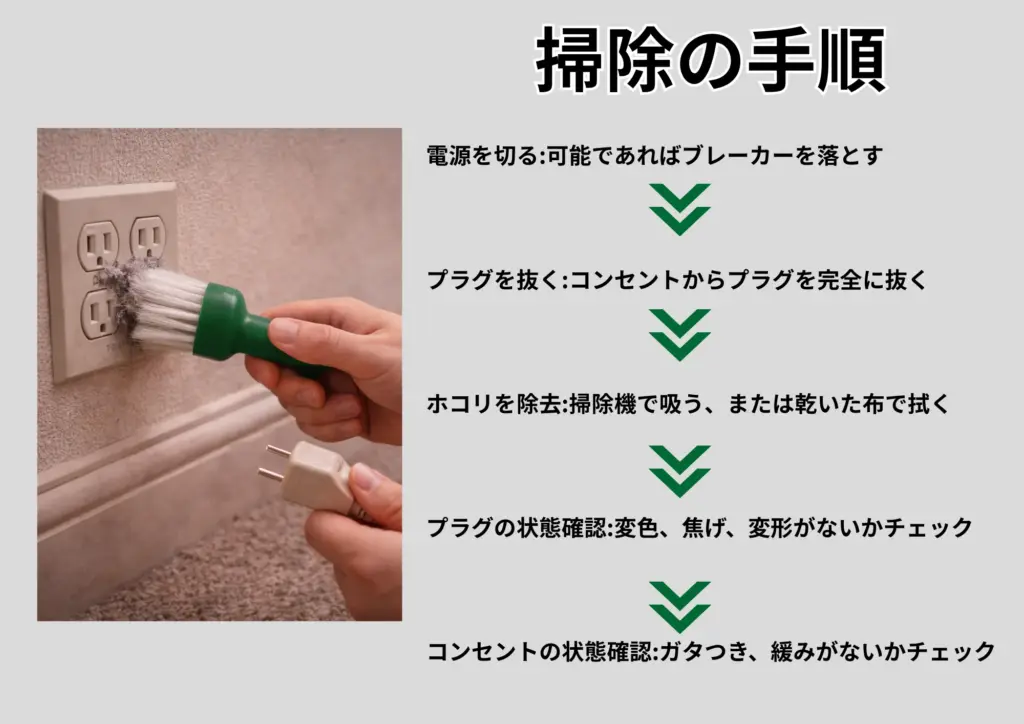 • 定期的にコンセントのホコリを掃除する:掃除機で吸う、乾いた布で拭く