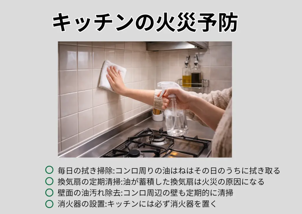キッチンの油汚れは、火災時に炎を一気に広げる「燃料」になります。