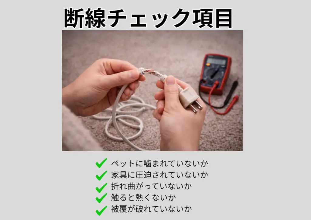 電気コードの断線は、ショートや発火の原因となります。以下のポイントを定期的にチェックしましょう。