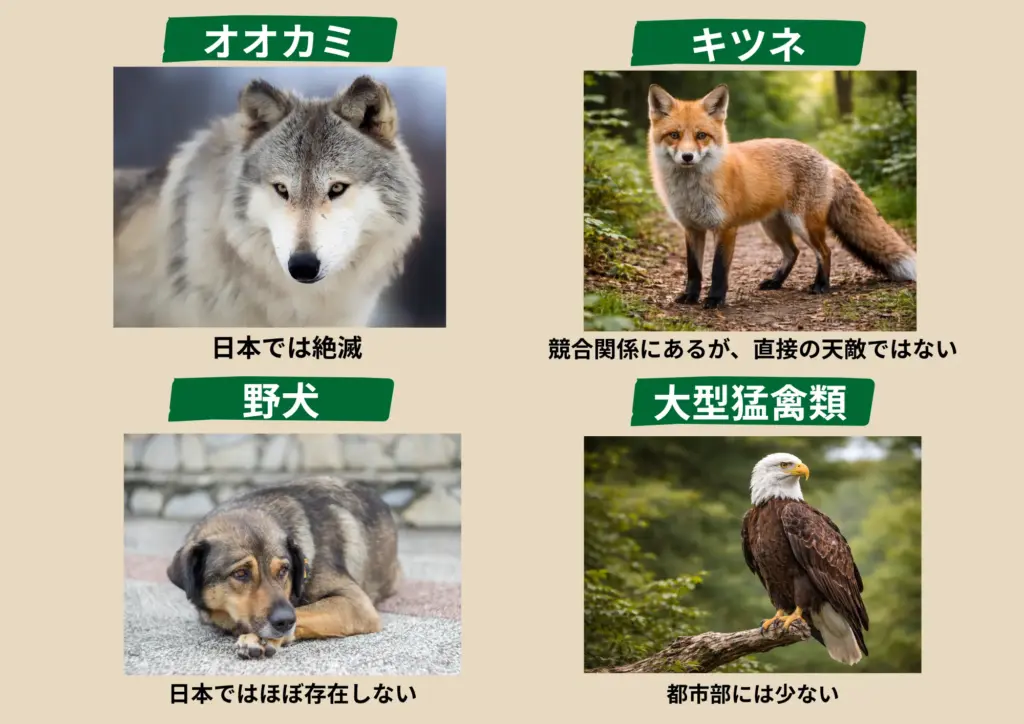 自然界では、タヌキにも天敵が存在します。しかし、都市部では天敵がほとんどいません。