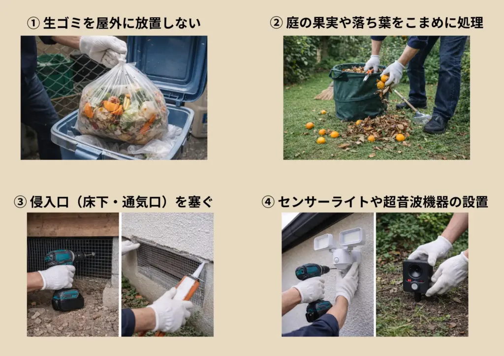 タヌキは縄張り意識があり、エサが豊富な場所には何度も戻ってきます。追い払うだけでなく、なぜその場所に来るのかを考え、原因を取り除くことが重要です。