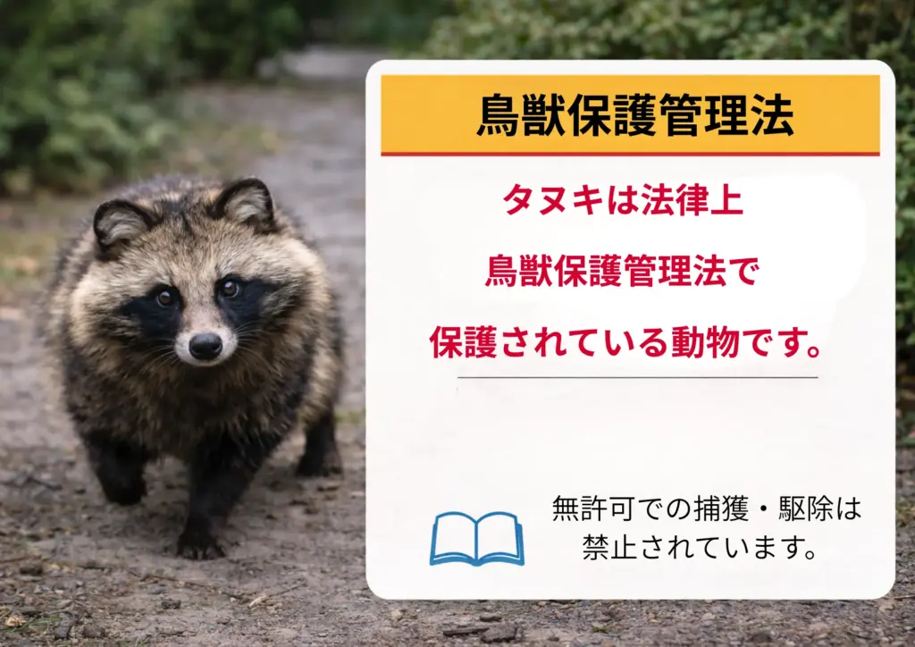 タヌキは鳥獣保護管理法で保護されているため、個人での捕獲は違法です。駆除が必要な場合は、まず自治体に相談し、許可を得た上で専門業者に依頼してください。