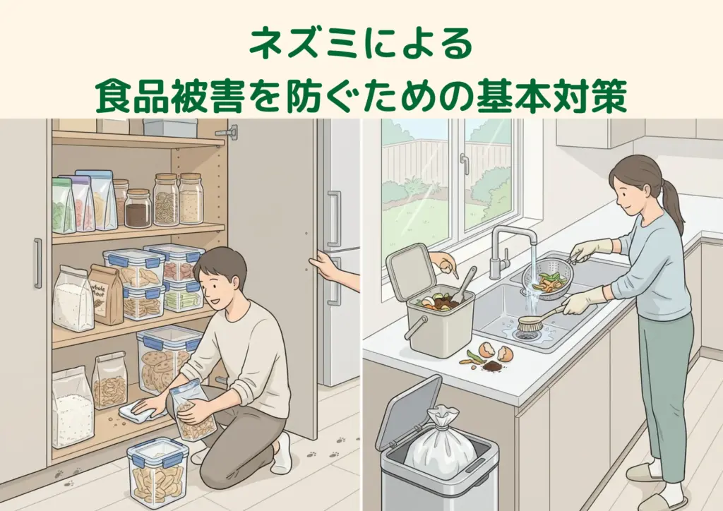 ネズミによる食べ物の被害は、特別な対策をしなくても、日々のちょっとした工夫で大きく減らすことができます。