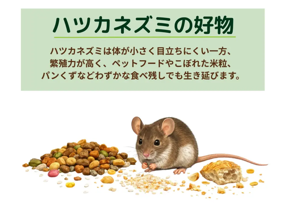 ハツカネズミが好むのは、ペットフードやこぼれた米粒、パンくずなど、人の生活空間に落ちている小さな食べ残しです。