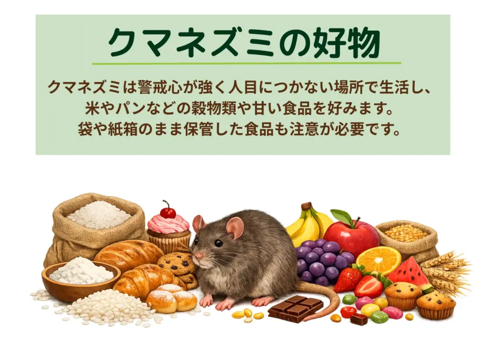 そんなクマネズミが好むのは、米やパン、小麦粉などの穀物類や、甘い匂いのするお菓子、果物といった食品です。