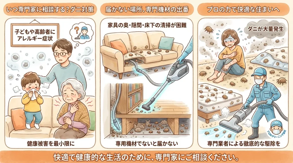 日常の対策だけではカバーしきれない「見えない場所のダニ」や「重度のアレルギー症状」には、プロの手を借りることも大切な選択肢です。
