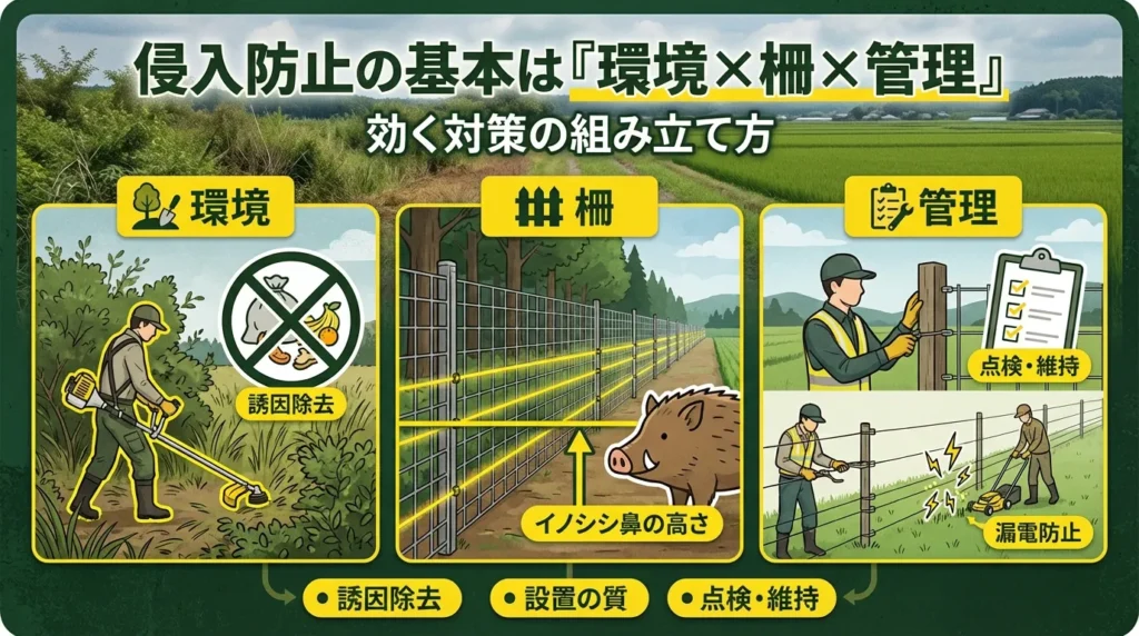 侵入防止の基本は「環境×柵×管理」:効く対策の組み立て方
