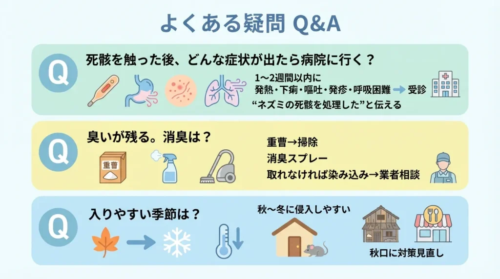 処理後1〜2週間以内に、発熱・下痢・嘔吐・皮膚の発疹・呼吸困難などの症状が現れた場合は、念のため医療機関を受診してください。その際、「ネズミの死骸を処理した」ことを医師に伝えると、適切な検査や治療につながります。