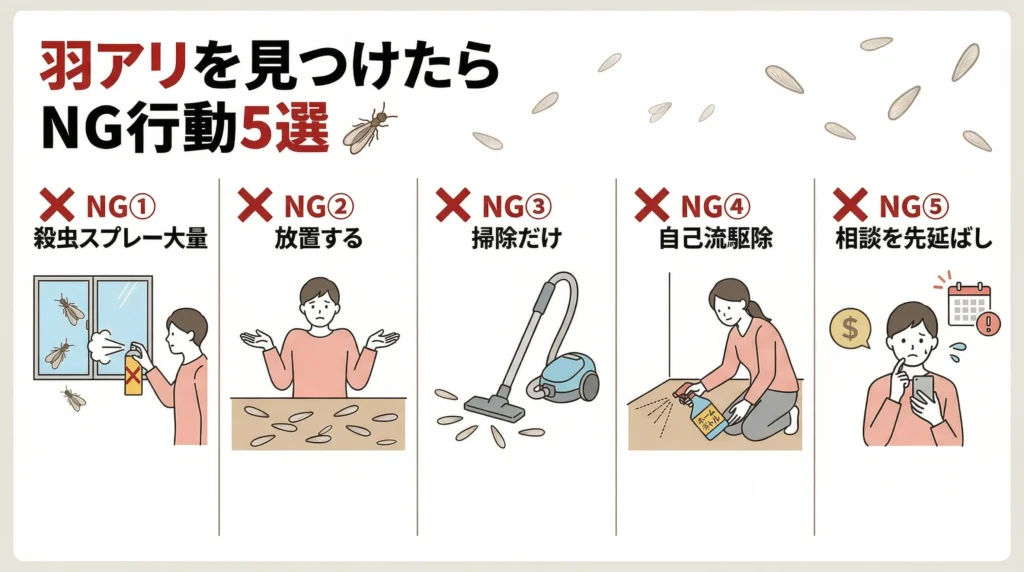 羽アリを発見したとき、焦ってとった行動が逆効果になることがあります。よくあるNG行動を5つ紹介します。