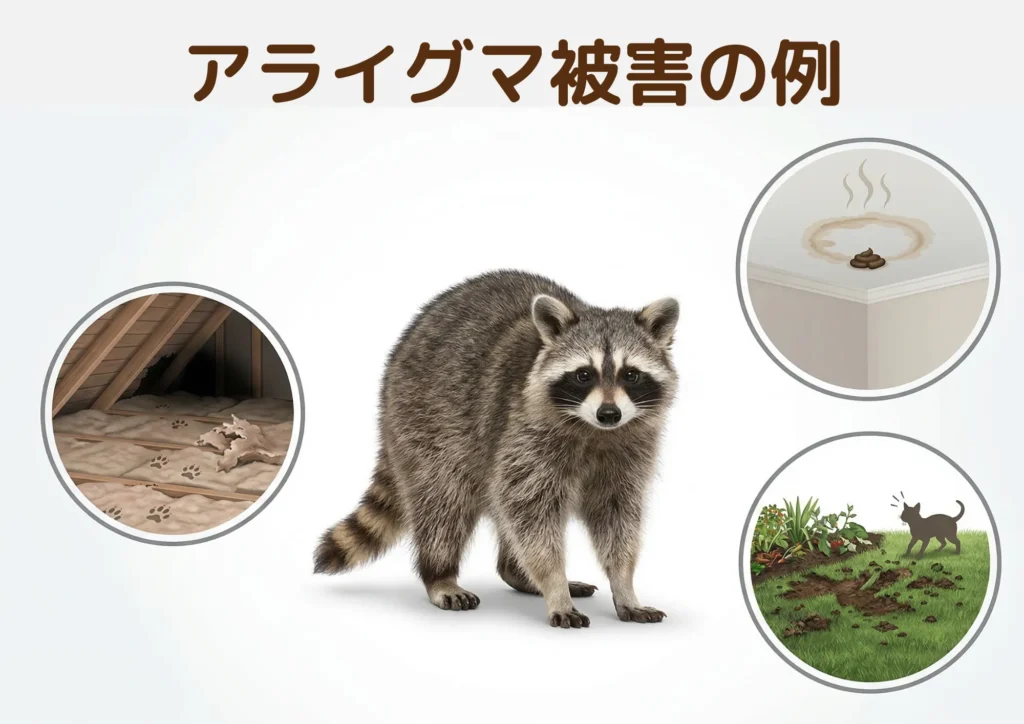 アライグマは雑食性で、人の生活圏にある食べ物を狙うことがあるためです。住宅街では次のような被害が報告されています。