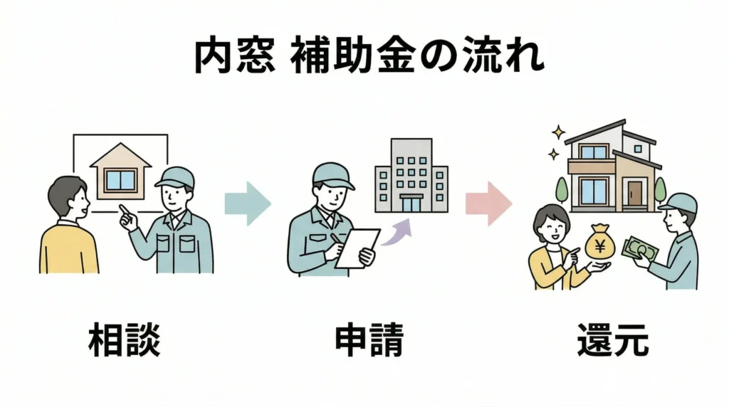 補助金は直接施主に交付されるのではなく、いったん登録事業者へ交付されたうえで、工事代金への充当や現金還元など、事前に合意した方法で還元されます。
